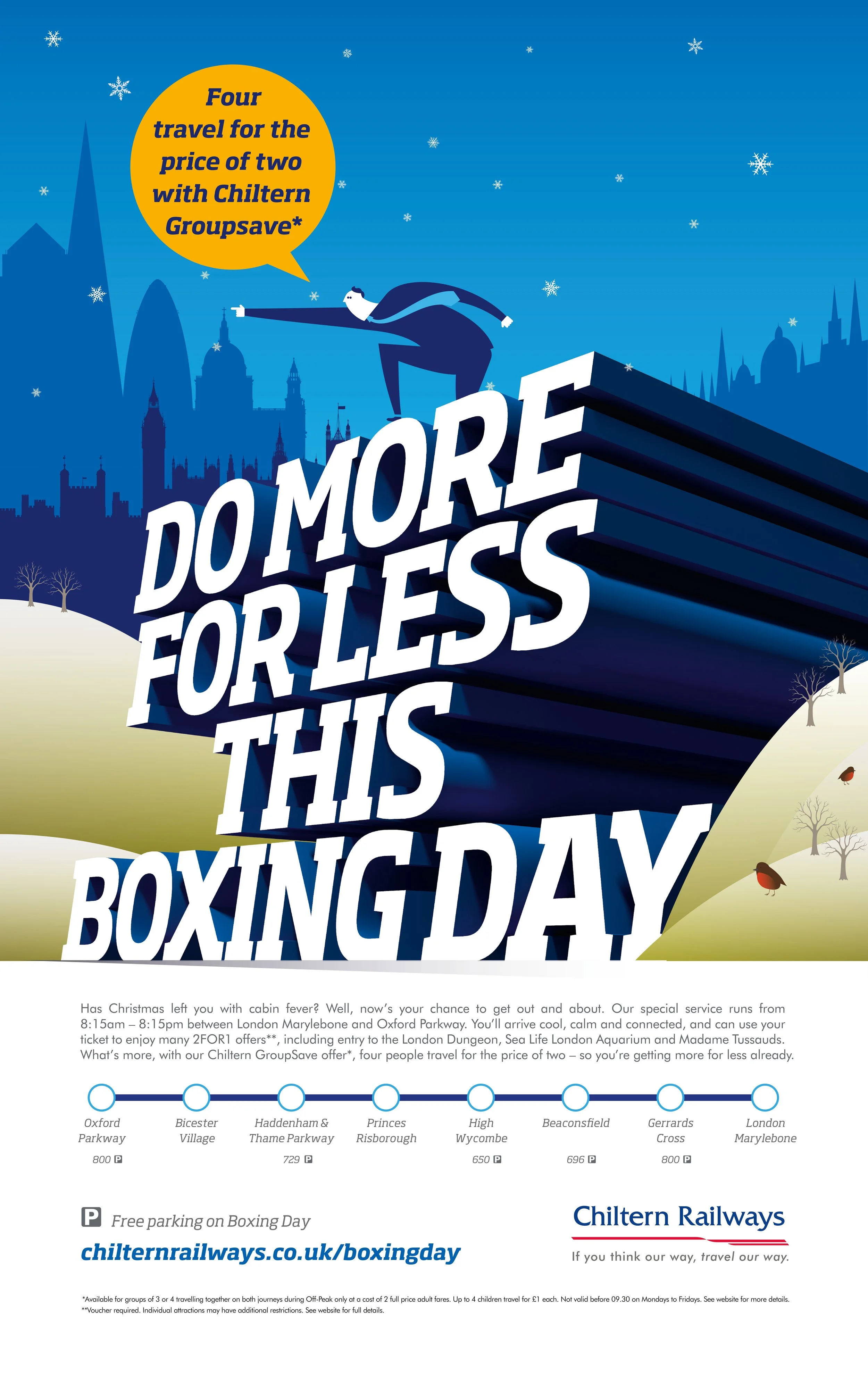 Chiltern RailwaysI worked alongside an art director to create a DM piece that encourages people to travel with Chiltern Railways on Boxing Day. View fullsize View fullsize View fullsize View fullsize